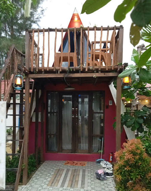 Area outdoor dilengkapi dengan kursi, lampu dekoratif, dan tenda camping untuk bersantai sambil menikmati deburan ombak.